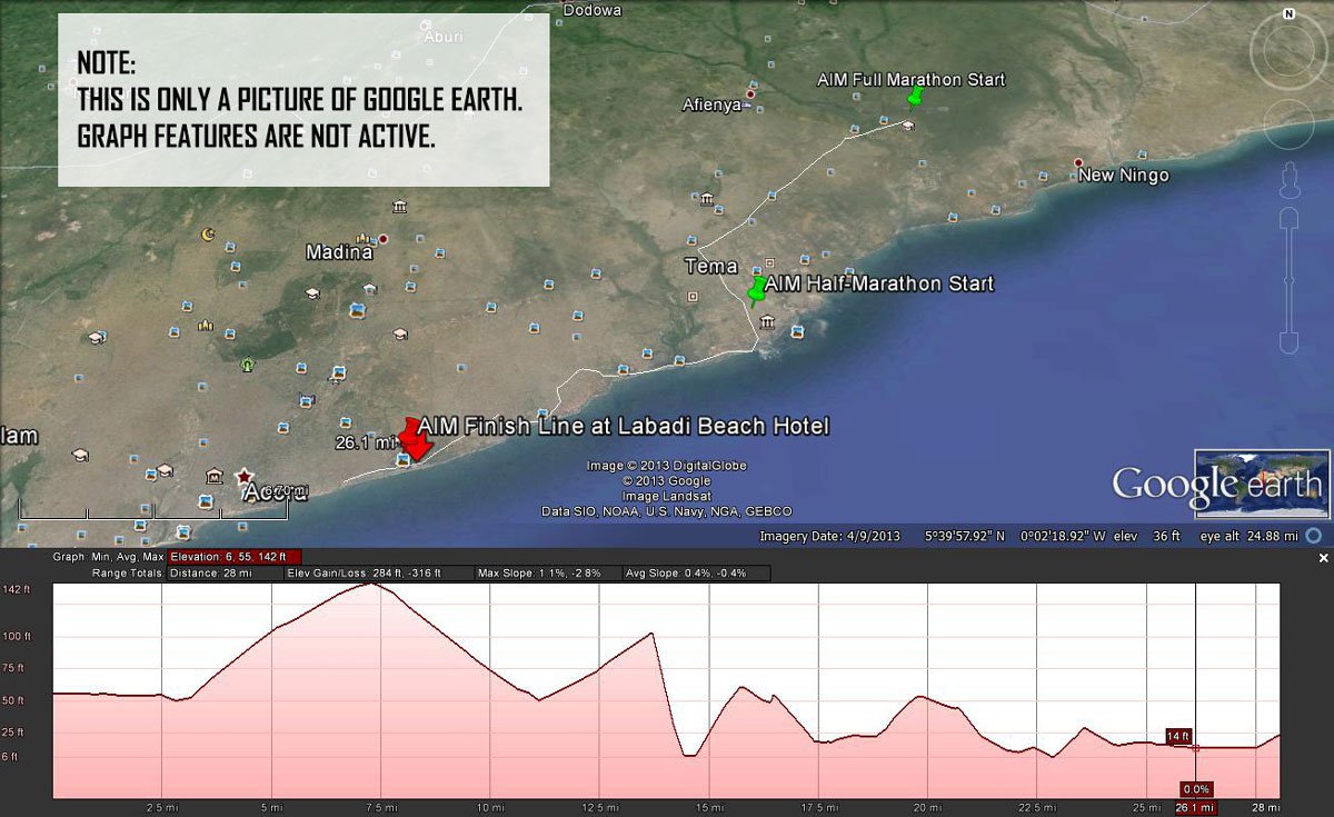 The full marathon starts at 0530hrs near Near Kofi Annan International Peacekeeping Training Ctr (KAIPTC), Teshie Road, Accra